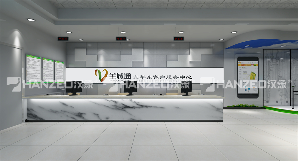 2、设计沿用羊城通品牌专属绿色主视觉,搭配简约白灰基底与大理石质感饰面,造型线条圆润大气,弱化商业感、强化便民属性,打造整洁、专业、亲和的空间氛围。