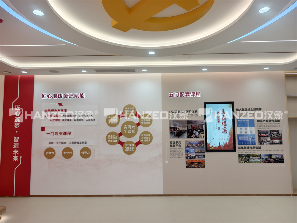 2、展厅内专门设置“工匠学院”板块,展示“五门配套课程”“师徒传承机制”“创新技能人才评价体系”等特色做法,呼应图片中“为大国燃薪火,为时代筑根基”的学院宗旨。