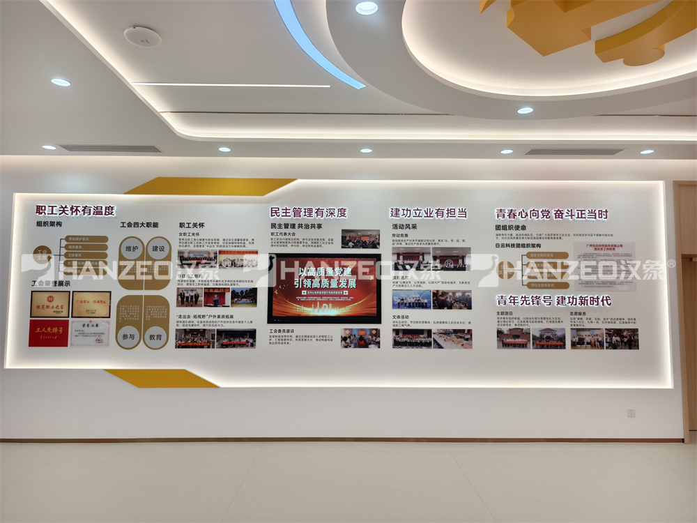 广东白云科技有限公司是一家以密封胶、新材料为核心的高新技术企业,始终重视党建引领与产业工人队伍建设。为系统展示企业党建成果、弘扬工匠精神、凝聚职工力量,白云科技决定建设一座集党员教育、工会活动、文化展示于一体的党群文化室。经过严格比选,企业委托汉象展览担纲本次展厅设计施工的任务,打造一个“有温度、有深度、有高度”的党建阵地。