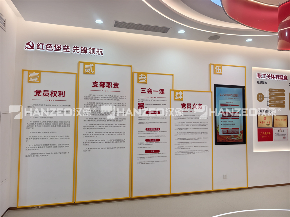 1、展厅以“永远跟党走·共筑中国梦”为精神主线,按照“红色堡垒·先锋领航—党员权利义务—三会一课—工会职能—工匠培育”的动线展开,配合“学习强国”“硕果盈枝”等荣誉展示区,完整再现企业党建工作的扎实成效。