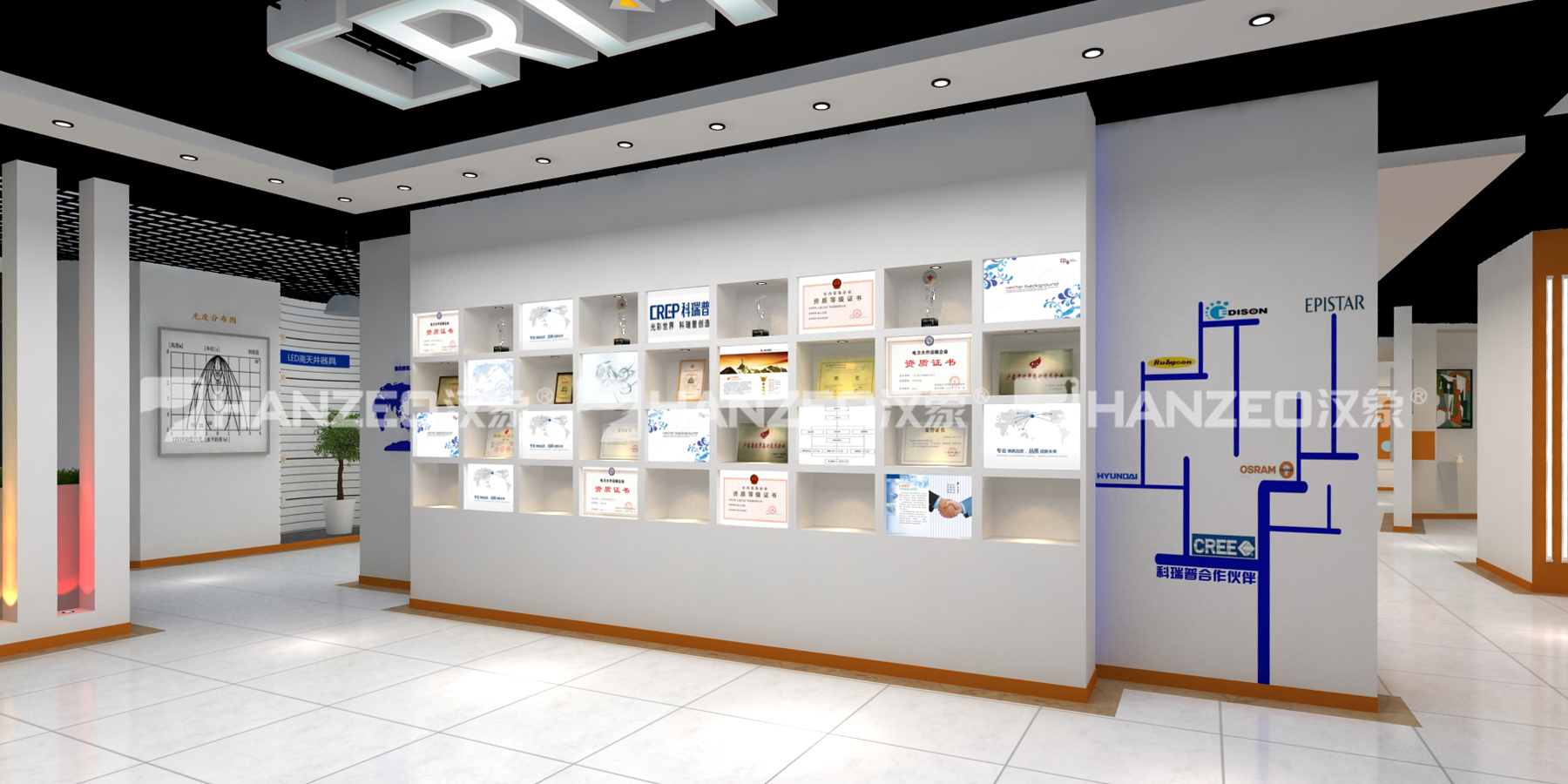 3、以立体展示墙的形式呈现企业资质荣誉、合作伙伴矩阵,通过发光标识与品牌色点缀,强化企业的行业公信力与合作生态优势;顶部发光品牌 LOGO 装置,将企业视觉符号融入空间设计,打造记忆点。