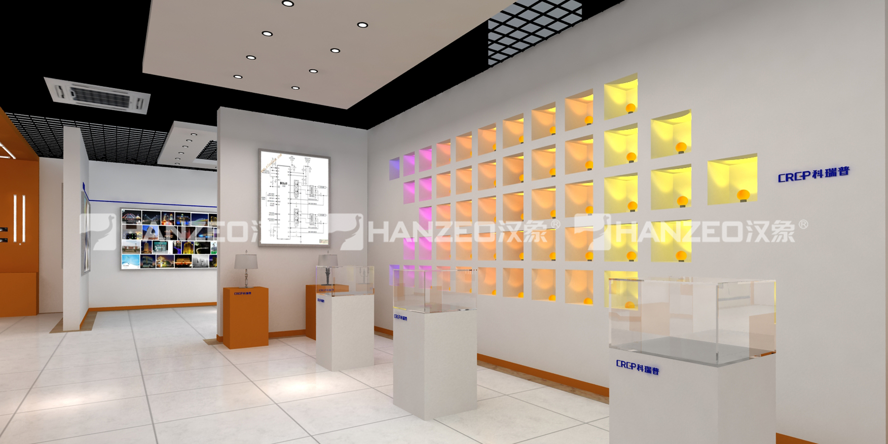 1、展厅以企业发展脉络为叙事主线,划分品牌形象区、资质荣誉区、合作伙伴区、产品体验区、技术展示区等多个功能分区,通过白橙为主的品牌色调搭配,打造连贯的沉浸式参观动线,完整传递企业 “光科技” 的品牌基因。