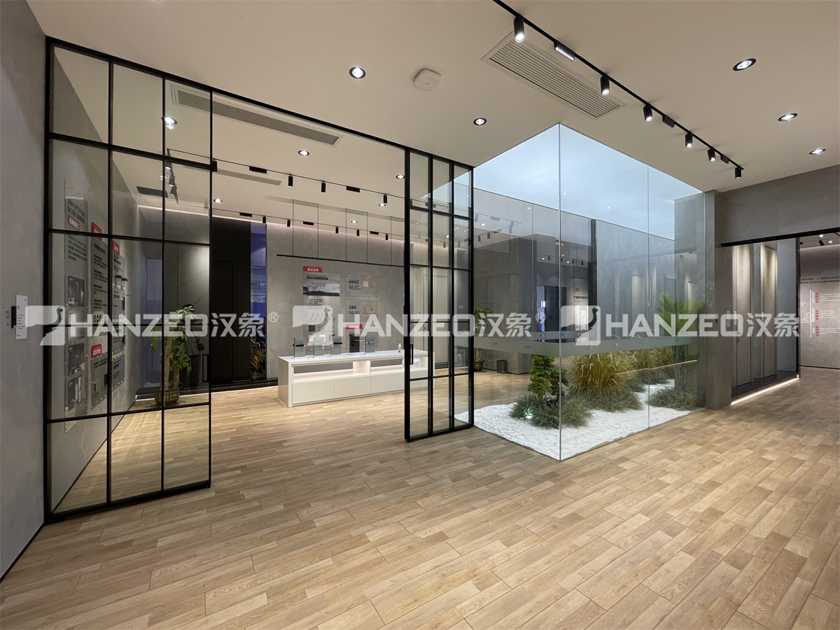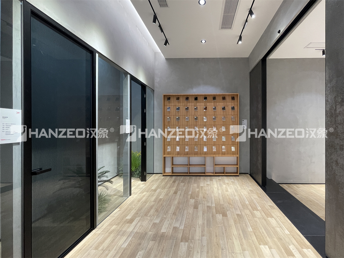 本次展厅设计以「少即是多」的现代极简风格为基底,用高级灰微水泥墙面、原木质感地面与无主灯照明系统,构建出干净通透的展示氛围,最大化突出门窗产品本身。