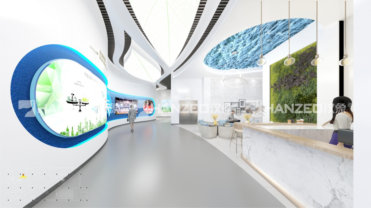 4、可持续材料应用:环保建材与节能配色呼应企业理念,塑造专业科技展厅设计氛围。