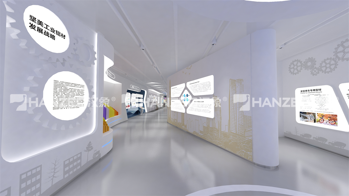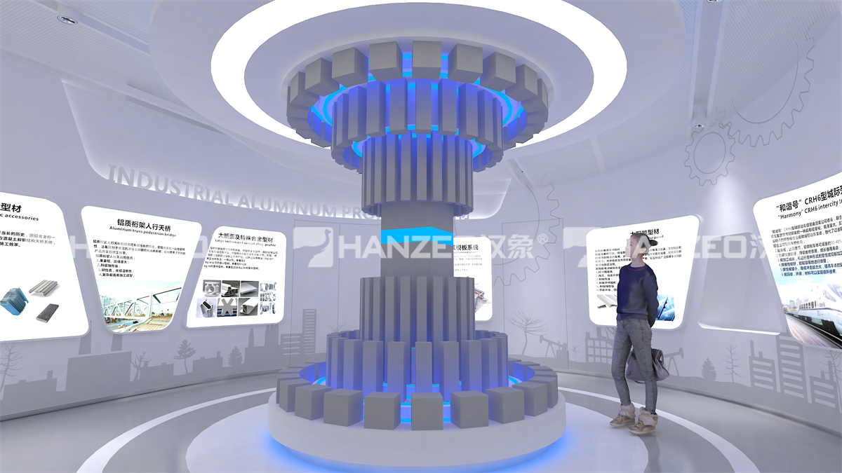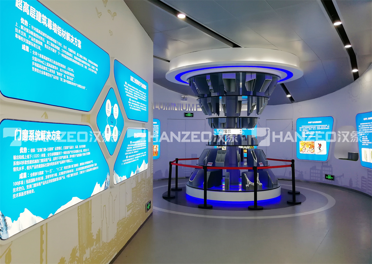 2、针对铝业行业特性,汉象展览创新采用 “实物 + 数字 + 互动” 的展陈模式:设置超高层幕墙铝材解决方案、门窗系统解决方案等主题展区,通过立体旋转展架直观展示型材结构;打造五性体验区,让观众直观感受门窗隔热、隔音等性能;搭配弧幕投影、沙盘模型、触控查询一体机等数字展厅设计元素,将复杂的铝型材技术转化为可视化、可体验的内容,兼顾专业性与科普性。