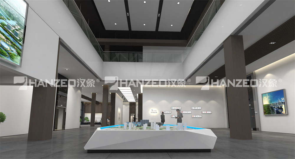 4、引入数字沙盘、多媒体互动屏等设备,打造数字展厅设计体验场景,通过动态演示呈现企业的项目案例与技术原理;同时以品牌色、发光标识、立体装置强化品牌记忆点,让空间成为企业品牌理念的可视化载体。