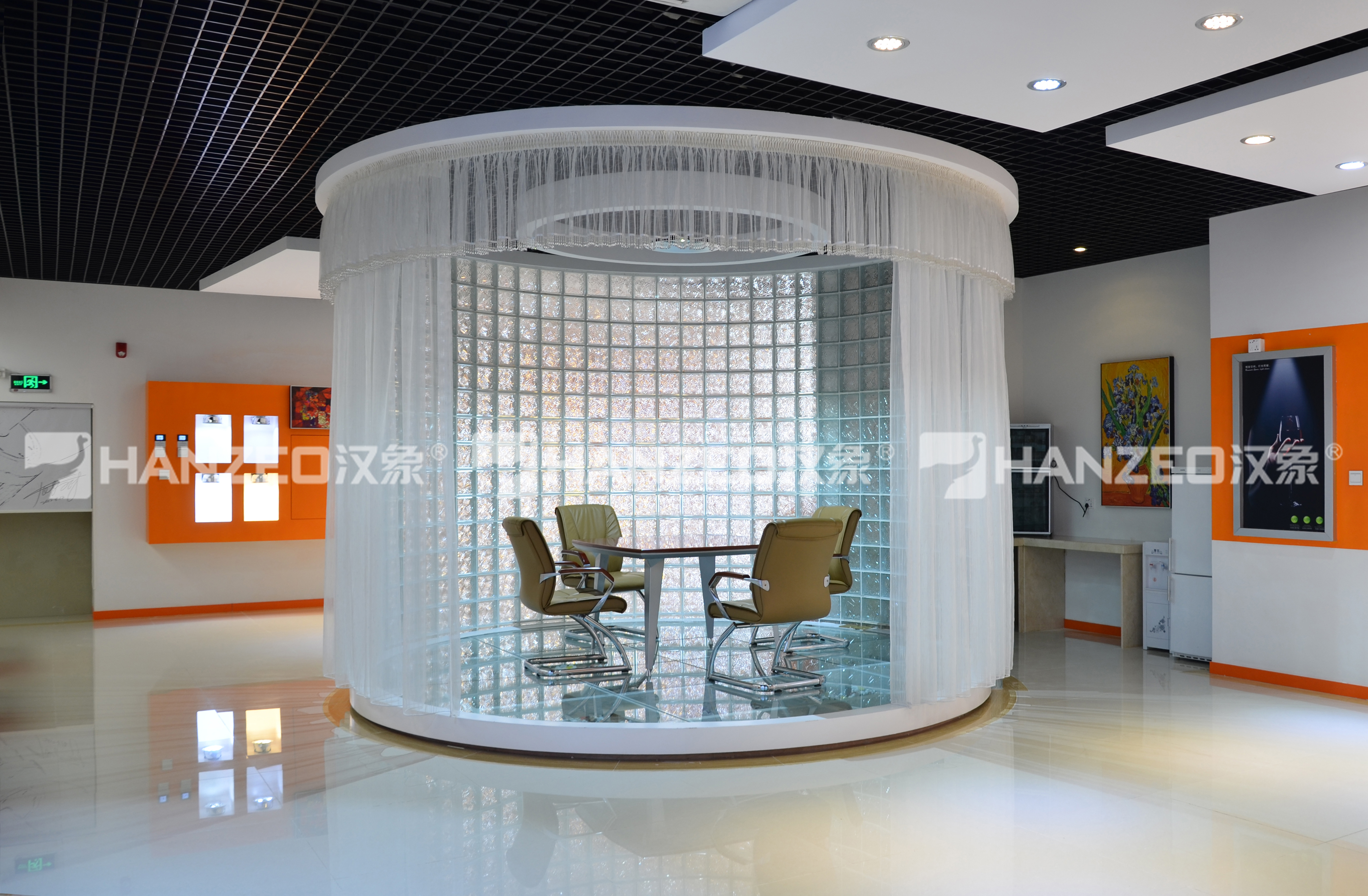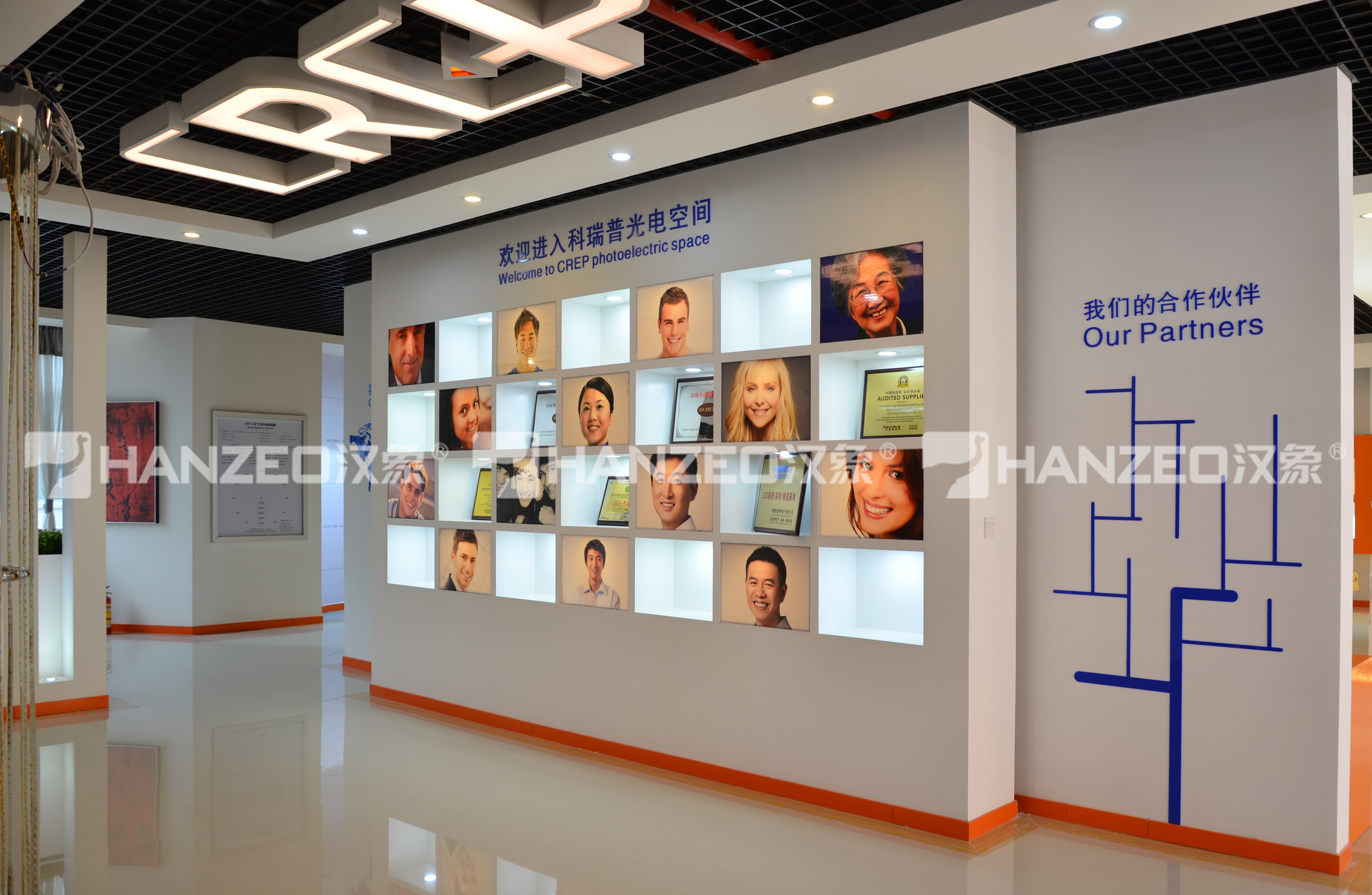 3、以立体展示墙的形式呈现企业资质荣誉、合作伙伴矩阵,通过发光标识与品牌色点缀,强化企业的行业公信力与合作生态优势;顶部发光品牌 LOGO 装置,将企业视觉符号融入空间设计,打造记忆点。