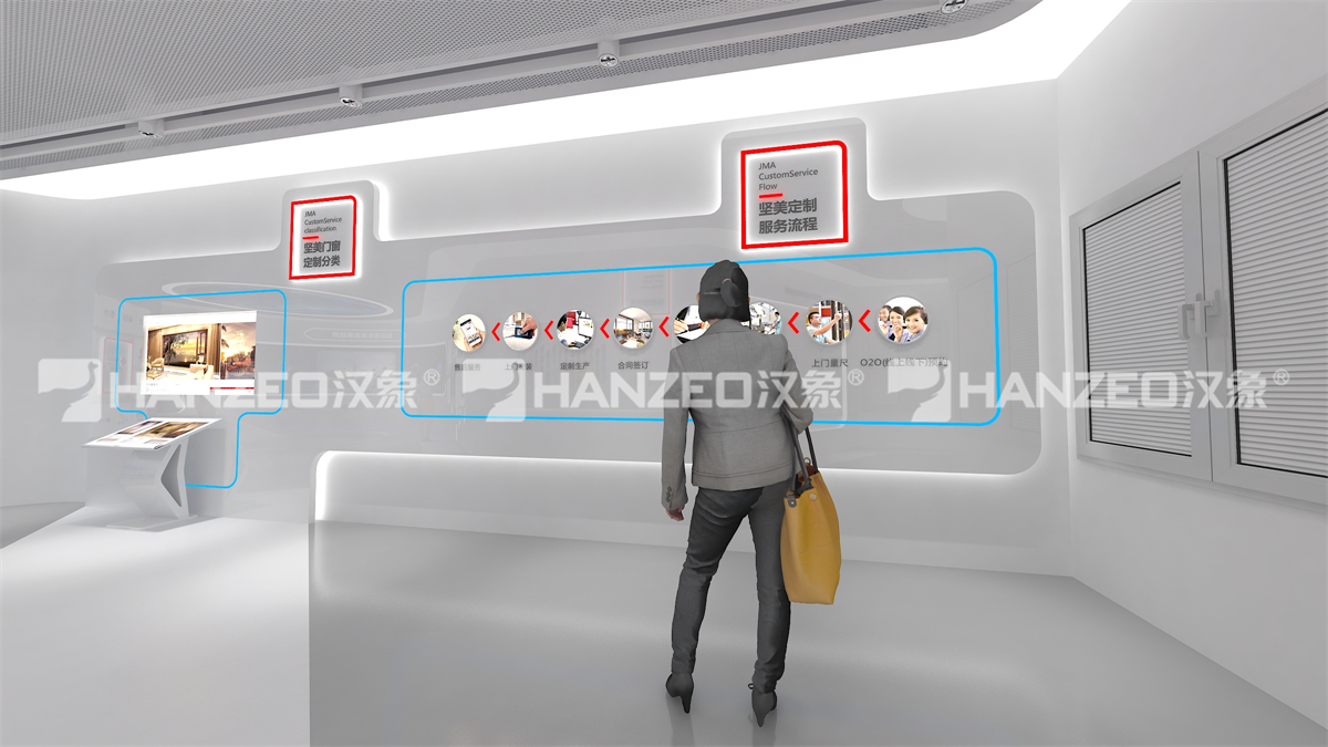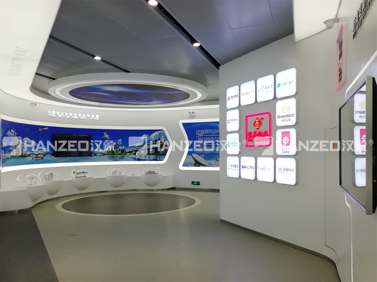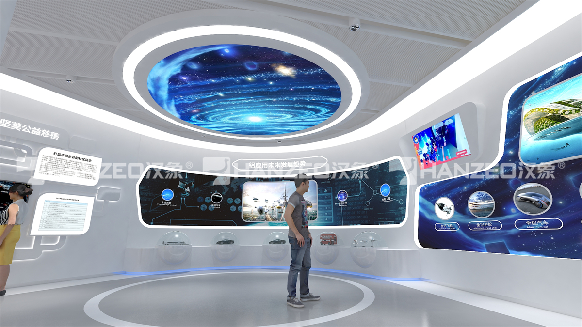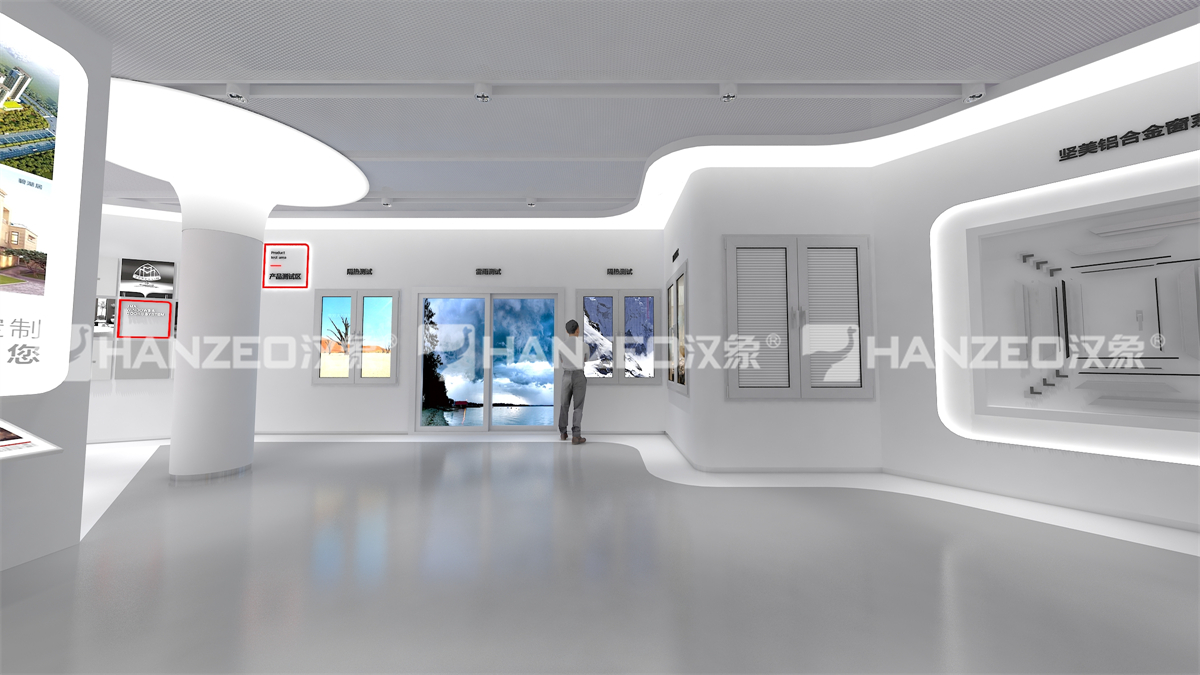 2、针对铝业行业特性,汉象展览创新采用 “实物 + 数字 + 互动” 的展陈模式:设置超高层幕墙铝材解决方案、门窗系统解决方案等主题展区,通过立体旋转展架直观展示型材结构;打造五性体验区,让观众直观感受门窗隔热、隔音等性能;搭配弧幕投影、沙盘模型、触控查询一体机等数字展厅设计元素,将复杂的铝型材技术转化为可视化、可体验的内容,兼顾专业性与科普性。